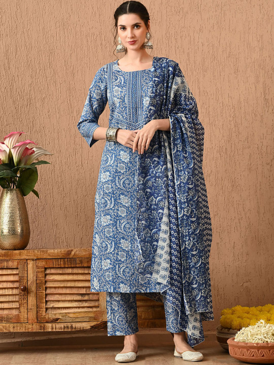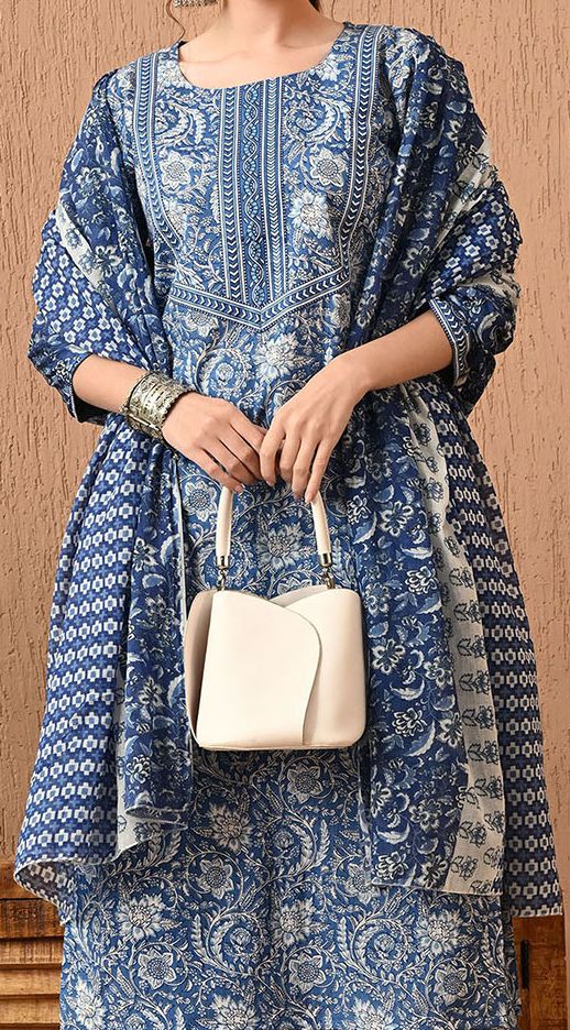 Elevate your everyday ethnic style with this elegant indigo blue kurta set, beautifully adorned with traditional handblock-inspired prints. The straight-fit kurta is paired with matching pants and a coordinated printed dupatta, creating a timeless and graceful ensemble perfect for both casual and festive wear.