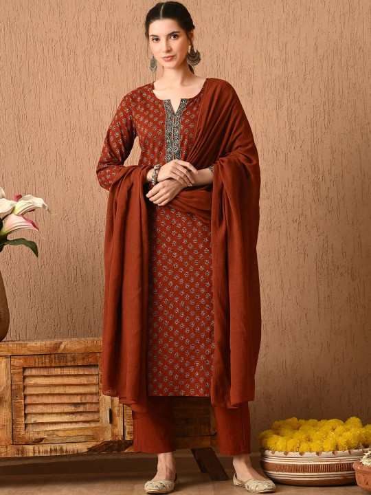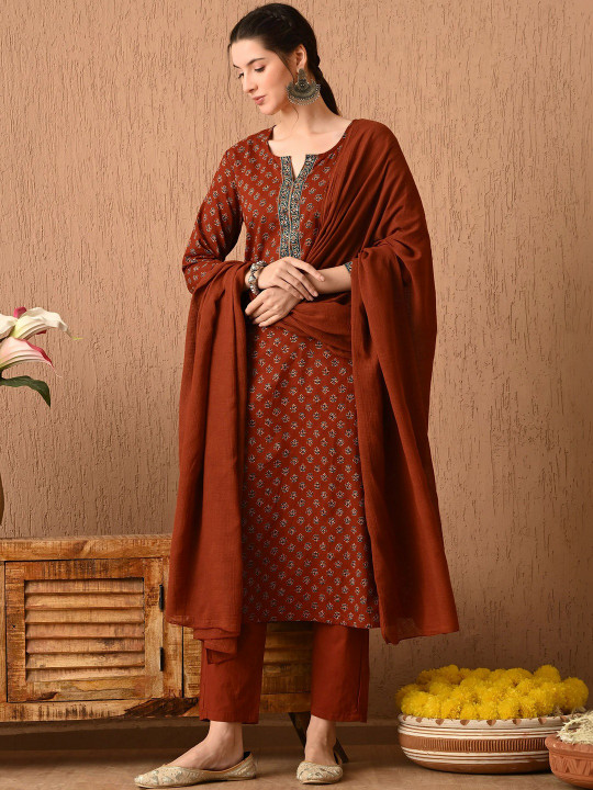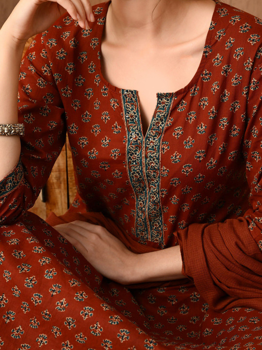 Rust Brown Ethnic Printed Kurta Set with Dupatta